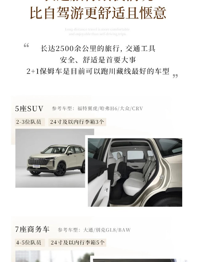(3)座位:左手第一个座位为驾驶员,右手第一个座位为导游,其他为普通座位,上车后请自行选择座位,高原长途旅行,队员之间请互相谅解;