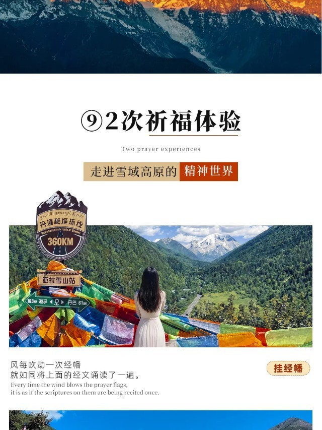 【行程概述】早晨乘车从成都出发,经闻名天下的"雨城"雅安,上雅康高速,穿越【二郎山隧道】,来到甘孜藏族自治州首府--《康定情歌》中的【康定】。我们的Citywalk之旅,就从横跨折多河的彩虹桥启程,站在彩虹桥上,脚下是奔腾不息的折多河,它如同康定的血脉,滋养着这座高原小城。旁边的情歌广场是康定城的核心区域,也是《康定情歌》的精神象征,而后边走边逛,步入【溜溜城】首先映入眼帘的是两个大大的转经筒,许多人都会在这里转动转经筒,祈求平安吉祥。沿着街道往里走,您会看到许多具有藏族特色的建筑,散发着浓郁的民族气息,途中就可以吃到不少特色小吃:酥油茶、牦牛酸奶、酥油蛋卷、牦牛肉、奶酥、藏式咖啡…...游玩后继续行车,越过川藏南线第一座高山——【折多山】(垭口海拔4298米),便来到了令人神往的“摄影天堂”新都桥,这里仿若一片如诗如画的世外桃源,神奇的光线、无垠的草原、弯弯的小溪、山峦连绵起伏、藏寨散落其间、牛羊安详地吃草……川西高原风光在此美丽地绽放,继续行车至雅江入住。