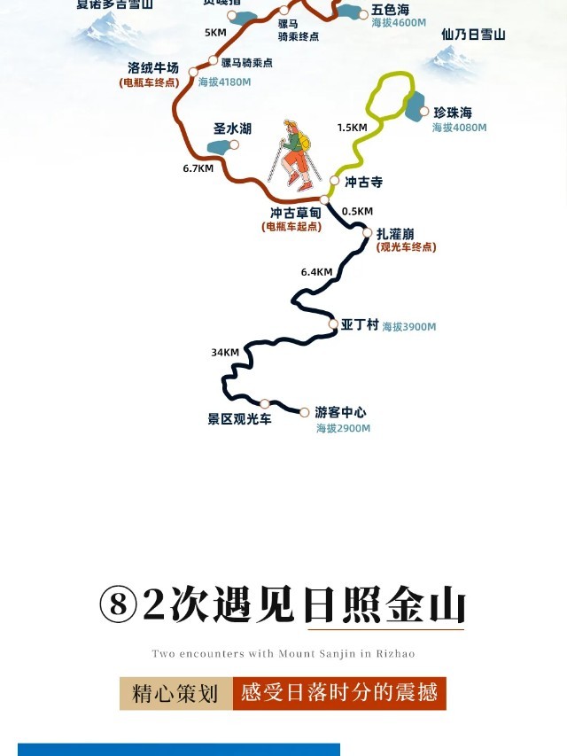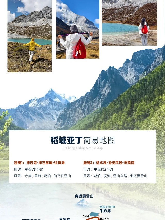 (5)当天游览线路参考:游客中心~景区观光车~亚丁村~景区摆渡车/观光车3.4km~扎灌崩~徒步0.5km~冲古寺~徒步1.5km~卓玛拉措(珍珠海)~仙乃日神山~原路返回亚丁村;