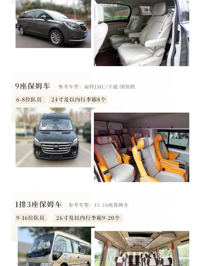 9-16位队员乘坐15-24座2+1保姆车;