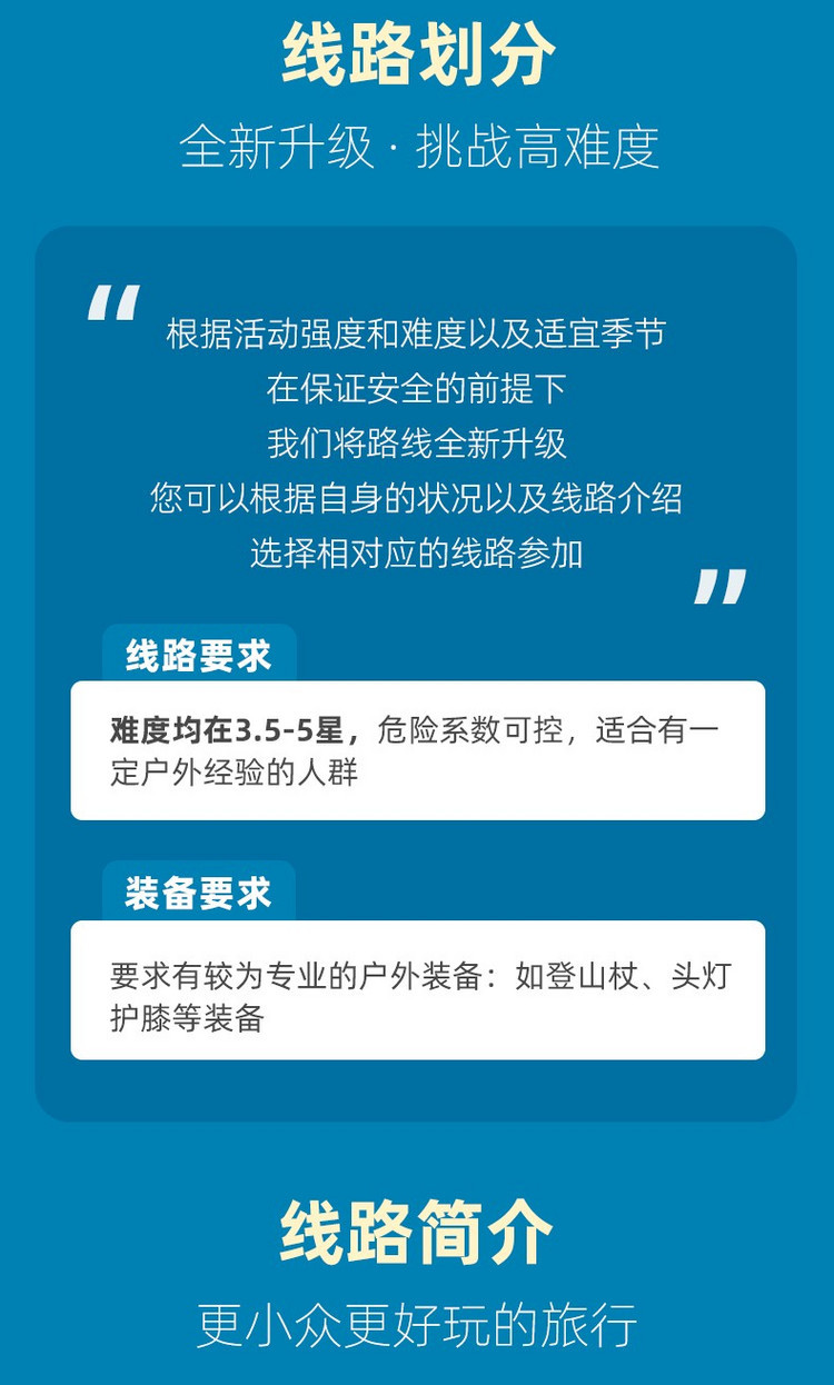 注:以上时间为正常安排时间,参与者体力不同,耗时可能会有差距。如遇天气、道路堵车、景区管控等外在因素影响,以领队安排为准。