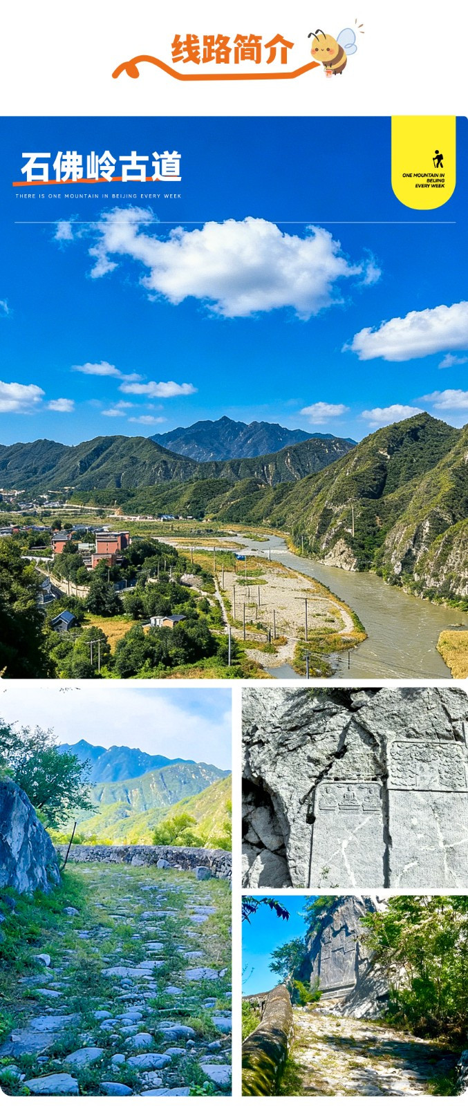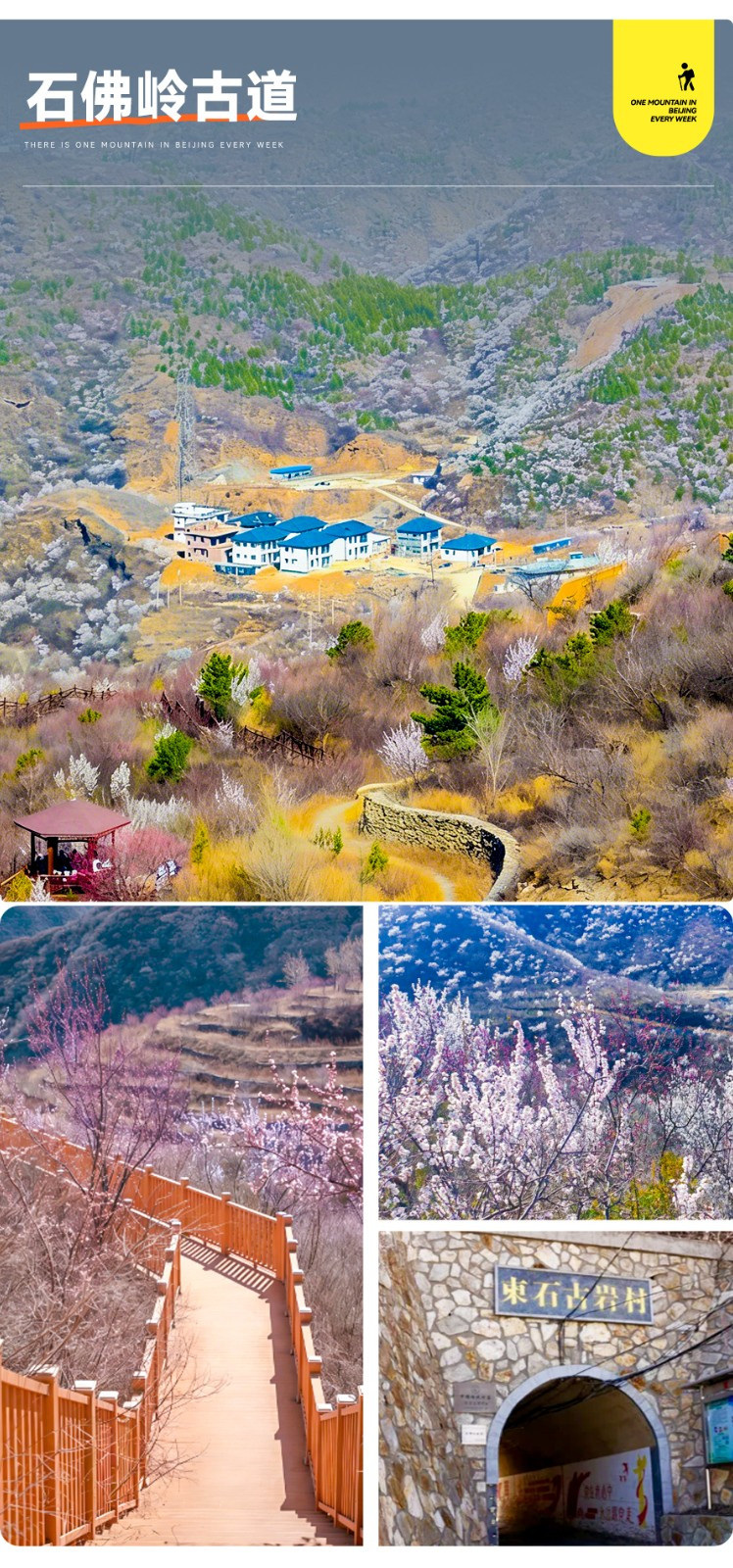 石佛岭古道位于北京市门头沟区王平镇东石古岩村,是京西古道上保存最完好的路段之一,全长约1000米。因其修建在半山腰的悬崖峭壁间,素有“空中栈道”之称,是俯瞰永定河与山下古村落的绝佳观景点。春季(尤其是三月至四月)是石佛岭古道沿线山桃花盛开的季节,沿途及山顶平台均有大片花海,景色宜人。古道内侧崖壁上现存四块明代摩崖石刻碑,其中一块碑额上刻有三尊石雕佛像,石佛岭即由此得名。古道上还清晰保留着昔日驮队、马帮行走留下的蹄窝印记。沿途可欣赏古道遗迹、摩崖石刻、村落风光及漫山春花。