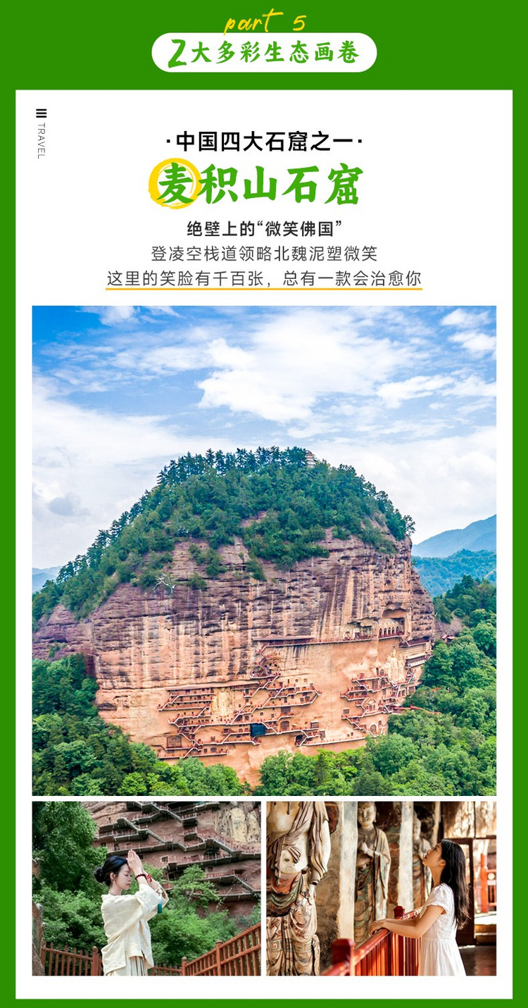 早餐后一路高速来到【麦积山石窟】(车程约45公里,用时约1小时,游玩时间约3-4小时)。麦积山风光秀丽,素有“秦地林泉之冠”的美誉。麦积山石窟位于岩壁陡峭、绿植环抱的麦积山,是西北著名的石窟之一。麦积山石窟是甘肃石窟之中非常重要、价值极高的一处,每一尊都别具个性,且鲜活,看遍西魏北周的历史兴衰。 因独特的泥塑优势,被称为“泥塑陈列馆”“东方雕塑馆”。麦积山的雕像,大的高达16米,小的仅有10多厘米。沿着山体修筑的木制栈道向上,沿途一座座石窟参观即可。与大家想象中不一样的是,麦积山的飞天是没有翅膀,没有羽毛,她是借助云彩而不依靠云彩,只凭借飘曳的衣裙、飞舞的彩带,凌空翱翔的美丽少女,是中国古代艺术家的天才杰作。石窟还保留大量宗教艺术资料,反映中国泥塑艺术发展和演变过程,为后世研究佛教文化提供丰富的史实。