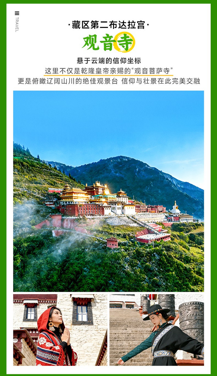 早餐后离开色达,前往【观音桥镇】。抵达后参观有“第二布达拉”之称的【观音寺】(车程约220公里,用时约5小时,游玩约1小时)。这座悬于云端的寺庙历史悠久,香火旺盛,加上毗盧遮那曾加持寺內供奉的四臂观音,寺庙所在地也是有名的纳勒神山。我们需要攀登一段台阶才能抵达,在此可俯瞰大渡河上游的壮丽景色。观音寺还留有面积ZUI大的经幡地,色彩斑斓的经幡随风飘扬,将所有信徒虔诚的祈祷带向了任何地方。下山途中,我们很可能在路边偶遇成群的藏猕猴,它们活泼可爱,但请勿随意喂食和挑逗,注意安全。
