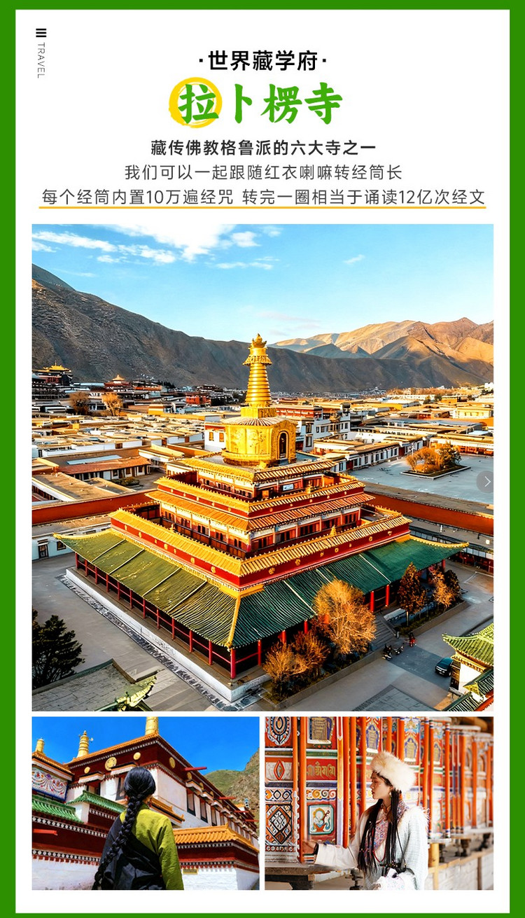 随后前往藏传佛教格鲁派的六大寺之一的【拉卜楞寺】(车程约30公里,用时0.5小时,游玩约2小时),这里保留有全国ZUI好的藏传佛,被世界誉为【世界藏学府】。 寺院规模宏大,这里有恢宏的寺院建筑群,供奉着无数的巨大佛像和各种精美的雕塑、壁画、法器等。拉卜楞寺超长的转经长廊是全世界少见的,共2000余个转经筒,转遍每个转经筒至少需一个小时。一般游览拉卜楞寺的方式都是顺时针绕寺一圈,这也是藏传佛教的朝圣仪式。在拉卜楞寺西南角有座古老的木桥,横跨夏河,过桥上山,站在晒佛台上能将拉卜楞寺的全景尽收眼底。带给他的信徒以平安与圆满。感兴趣的小伙伴可以沿着转经长廊推转经筒,感受藏民文化。