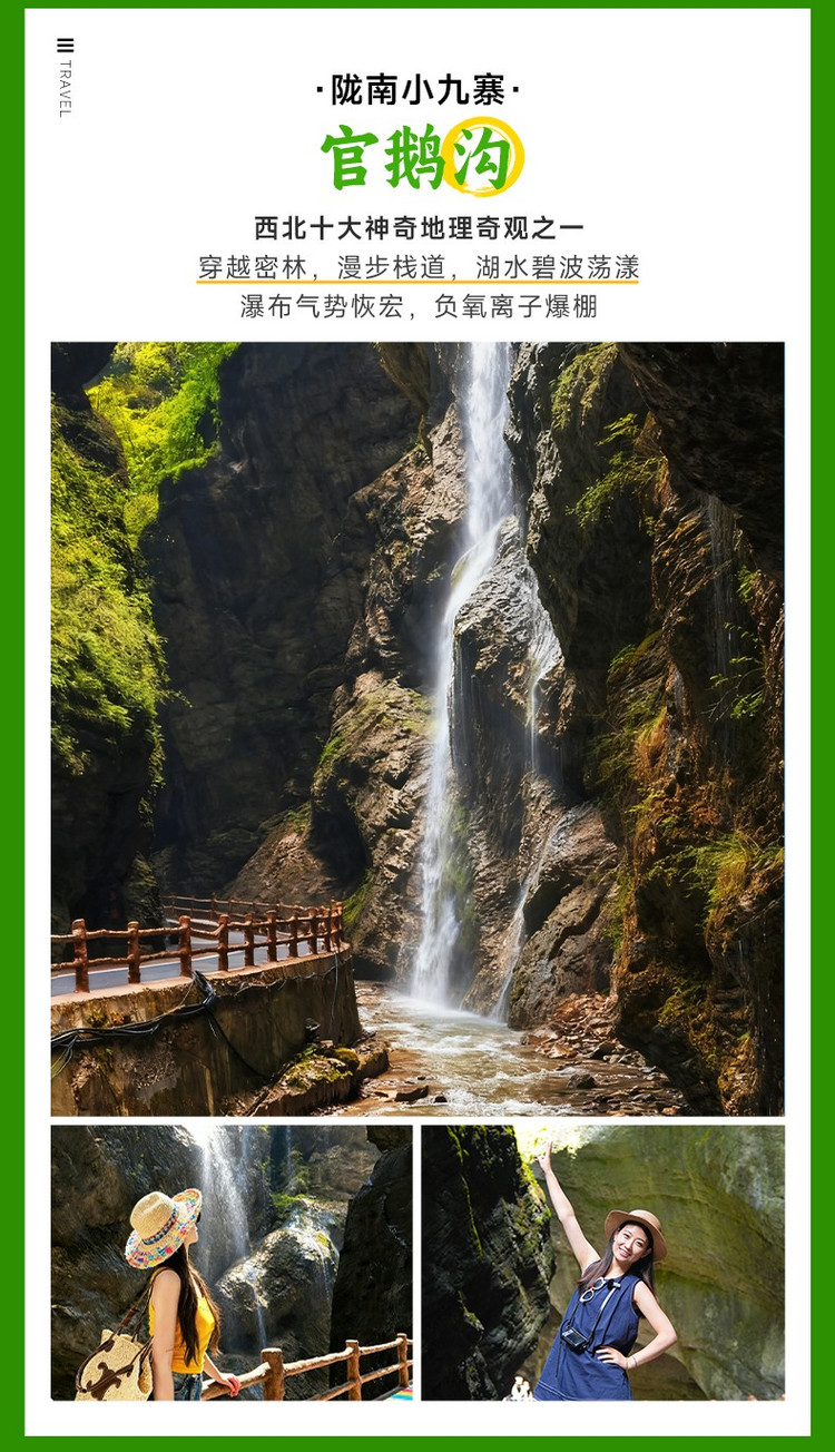 早餐后,来到中国超具潜力的小众美景【官鹅沟】(车程约15分钟,游玩时间约3-4小时)。官鹅沟是西北十大神奇地理奇观之一 ,藏于陇南宕昌的山水秘境,被誉为"北方小九寨"。这里峡谷与飞瀑共舞,雪山同湖泊相映,构成一幅原始而灵动的画卷。官珠沟内,五十米高的官鹅天瀑如白练垂空,五瀑峡层层叠落的水帘奏响自然交响乐;鹅嫚沟中,鹅嫚湖碧波倒映着终年积雪的雷古雪山,神象沐浴池的钙化泉泛着翡翠般的光泽,移步换景间,既有九寨的灵动,又具西北的雄浑,是遗落人间的仙境。
