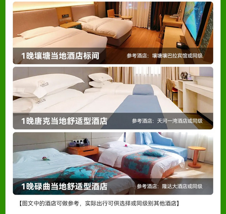3、 行程中的所列的酒店类型,2星/2钻=经济型;3星/3钻=舒适型;4星/4钻=高档型;5星/5钻=豪华型;意为评定或条件到达相应标准的酒店,少部分地区,由于政策等因素,可能存在酒店条件满足,但未进行星钻评定的情况;