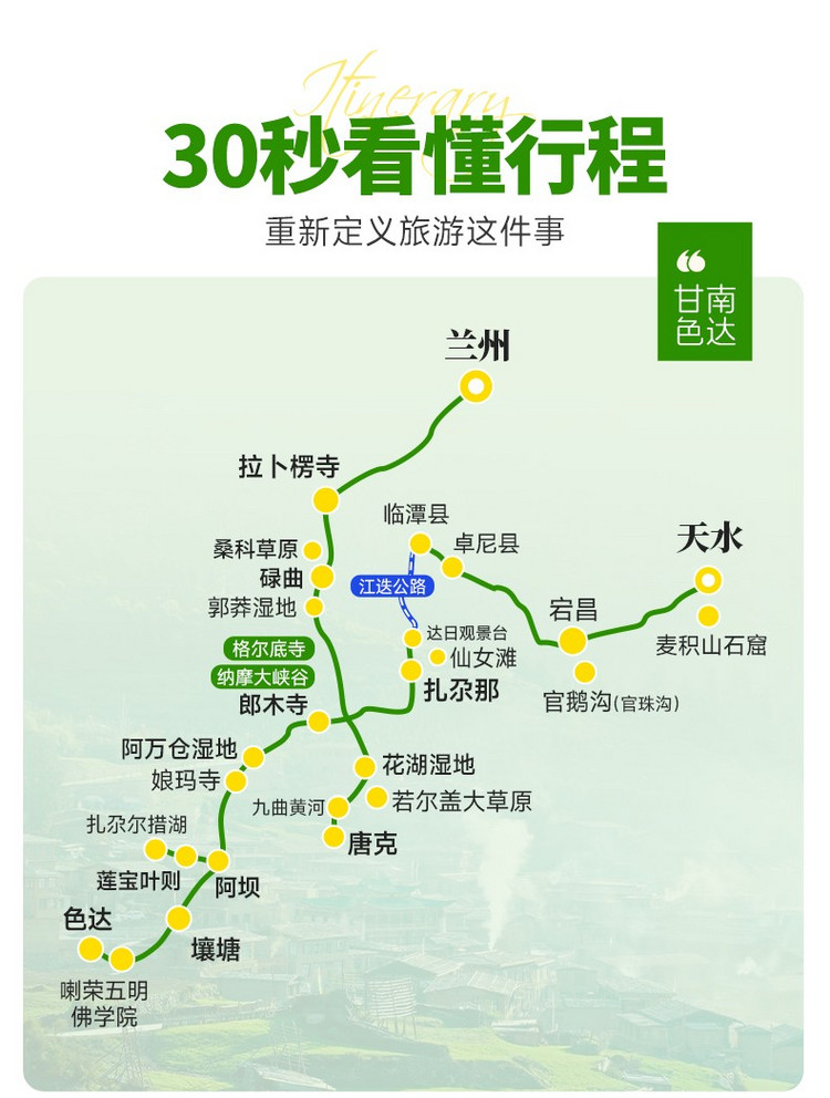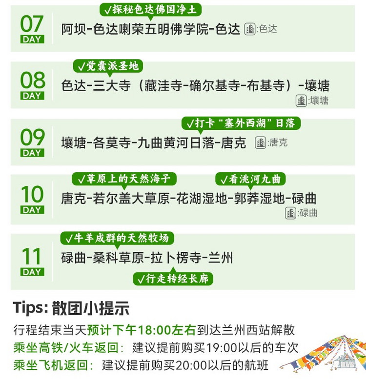 2、行程结束当天18:00左右抵达兰州西站,大家可以依据自己的时间,自行选择继续游玩或是启程回家。火车/高铁建议购买19:00以后的车次,飞机建议购买20:00以后的航班。兰州火车站距离兰州中川机场约68公里,车程约1.5小时。兰州站距离机场大巴客运中心站徒步300米,到达机场71公里,用时1小时25分钟左右,大家根据自己的航班车次选择返程票。