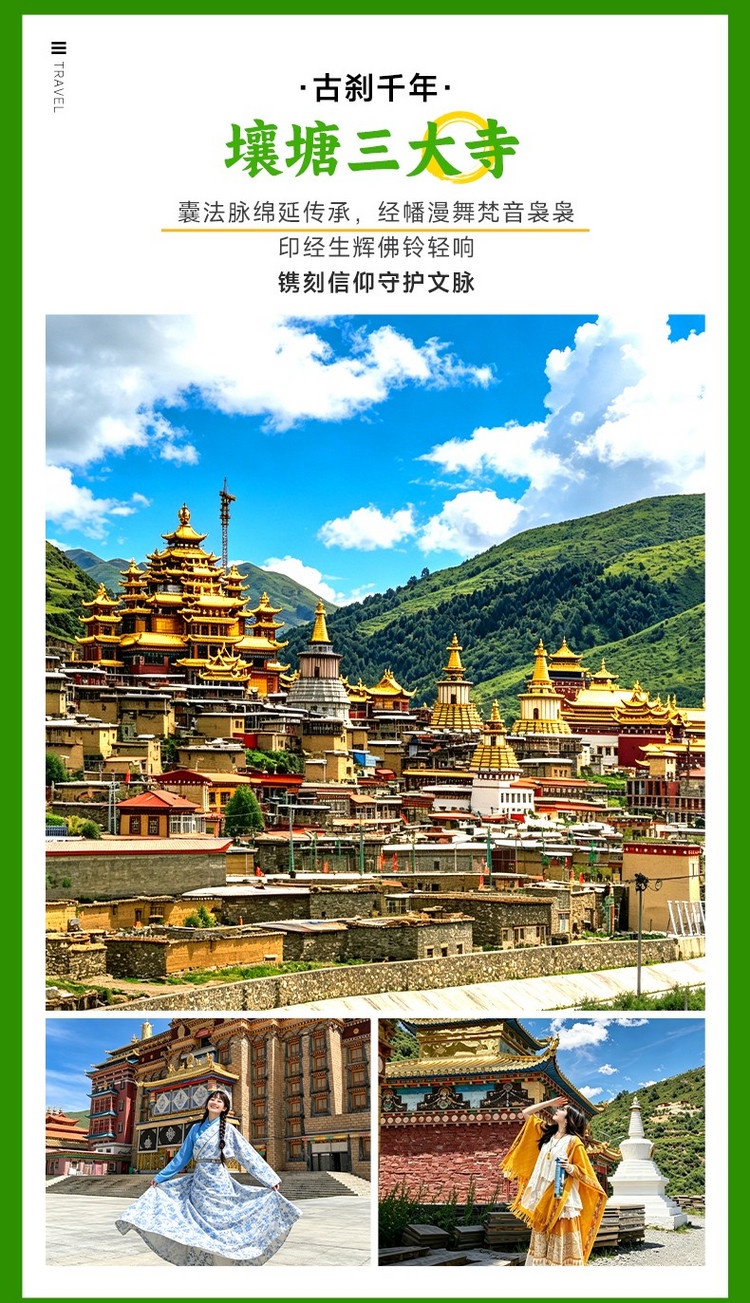 早餐后,我们告别色达,启程前往【壤塘】,抵达后将依次探访觉囊派根本道场、藏区唯一保存完整的觉囊寺庙群——【三大寺】(藏洼寺-确尔基寺-布基寺)(车程约190公里,用时约4小时,游玩约3小时)。三大寺静卧于壤巴拉山前,则曲河蜿蜒环绕,既是藏传佛教觉囊派的核心传承圣地,承载着千年厚重的宗教文化底蕴,也是元、明、清三朝管辖川甘青交界区域的重要历史见证,千百年来香火绵延不绝,静谧而肃穆,尽显高原寺庙的庄严气象。