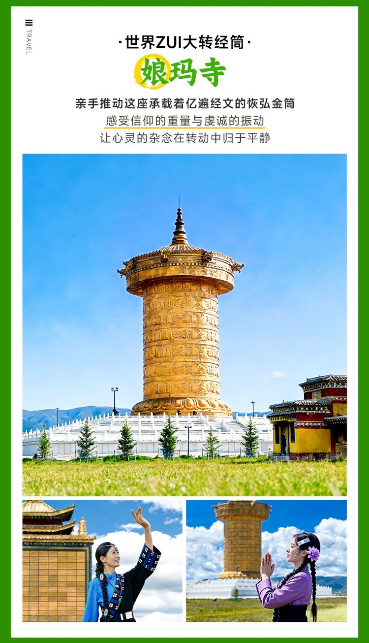随后来到【娘玛寺】】(车程约10公里,用时约15分钟,游玩约1小时),亲眼见证并推动世界ZUI大的转经筒,记得顺时针走,切勿嬉笑打闹,转经就相当于诵经,尊重当地的民俗风情。